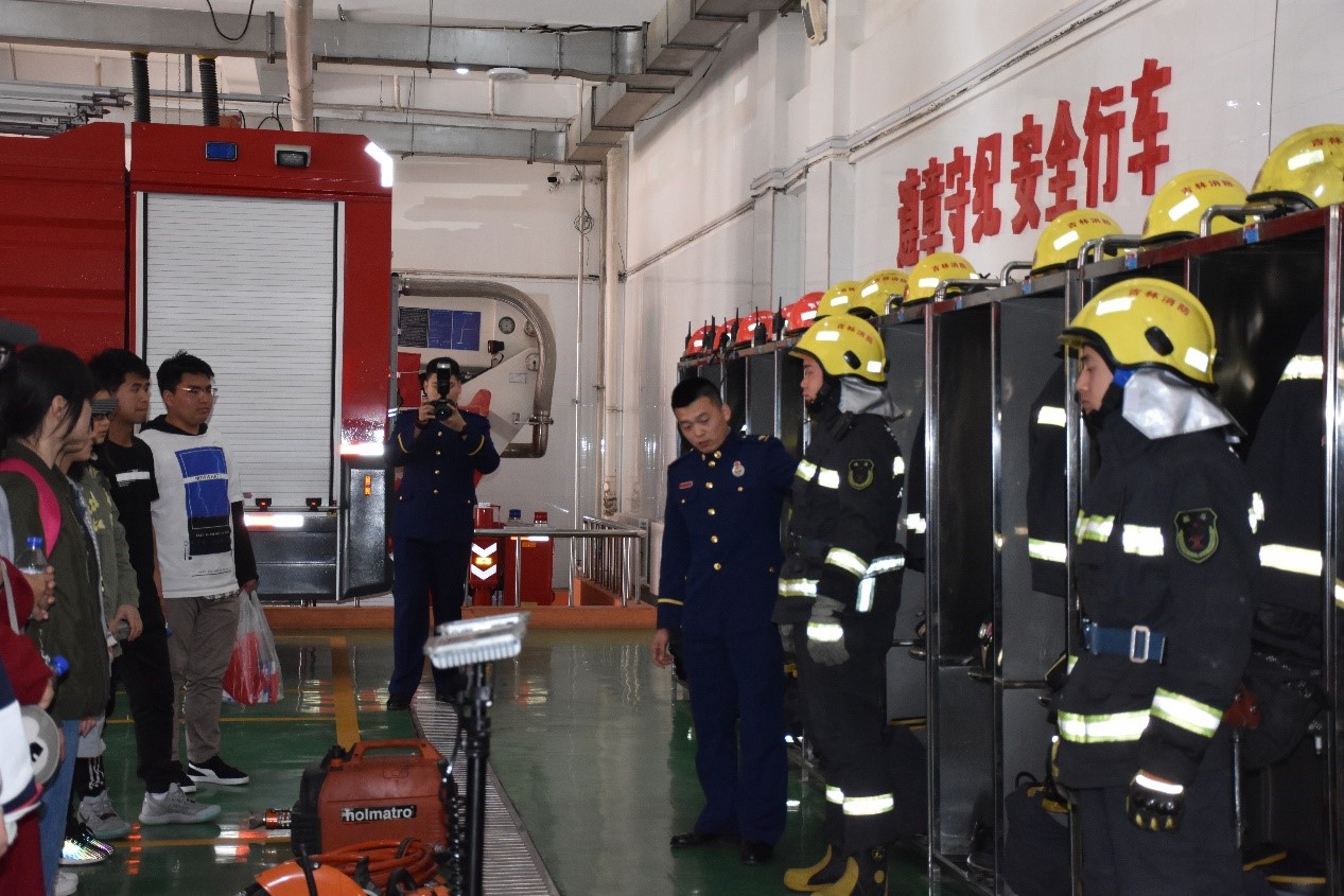 随后进行参观,消防大队为我们展示消防车辆与消防器材,指导员向我们介绍,参观的前一天消防车半夜还参加了灭火救灾。消防战士还向我们介绍了消防员的随身装备,消防车辆的具体功能。同学们了解了各类消防器械,掌握日常消防器具使用方法,增长了见识。参观消防员的生活区,了解到了消防员战士都是二十四小时待命的,随时为了各种情况而准备,警报声就是命令。因此,消防员战士的日常的生活压力比较大,需要社会的关心。最后,我们观看了消防宣传影片,更加深刻而具体的明白消防员的责任与使命担当,增强了同学们的社会责任感,激发了同学们的爱国奉献情怀。