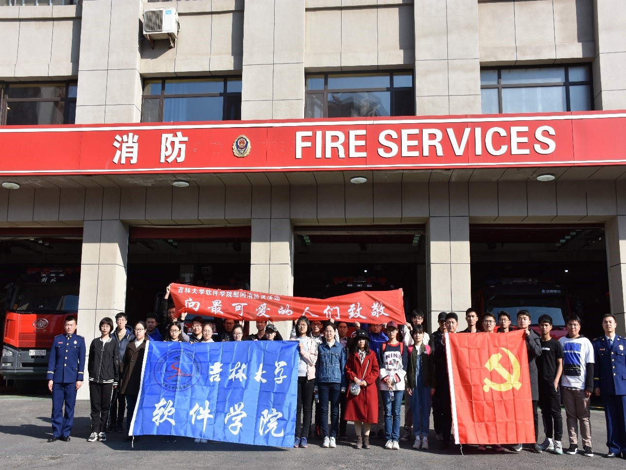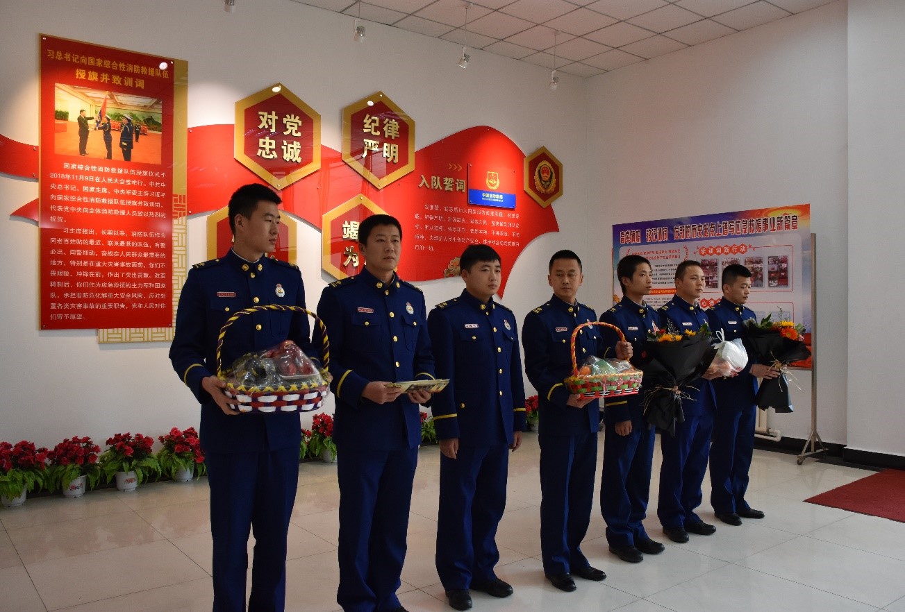 到达目的地后,消防大队指导员向同学们表示欢迎与感谢,同学们向消防战士送上慰问品、明信片和锦旗,表达了同学们对消防战士的爱戴与敬畏之情。