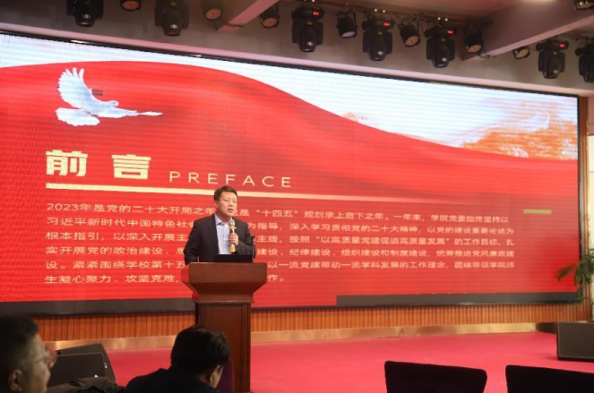 随后,党委书记宫皓宇同志发表讲话。宫皓宇书记从思想建设、文化引领、组织建设、纪律建设等几个方面,回顾2023年公司党建工作的重点,并对为公司发展作出贡献的每一位师生表示了深深的敬意与感谢。四季更迭,岁月重启,宫皓宇书记祝公司党委全体师生在新的一年龙行龘龘,前程朤朤,期待共同推动公司党委工作高质量发展。