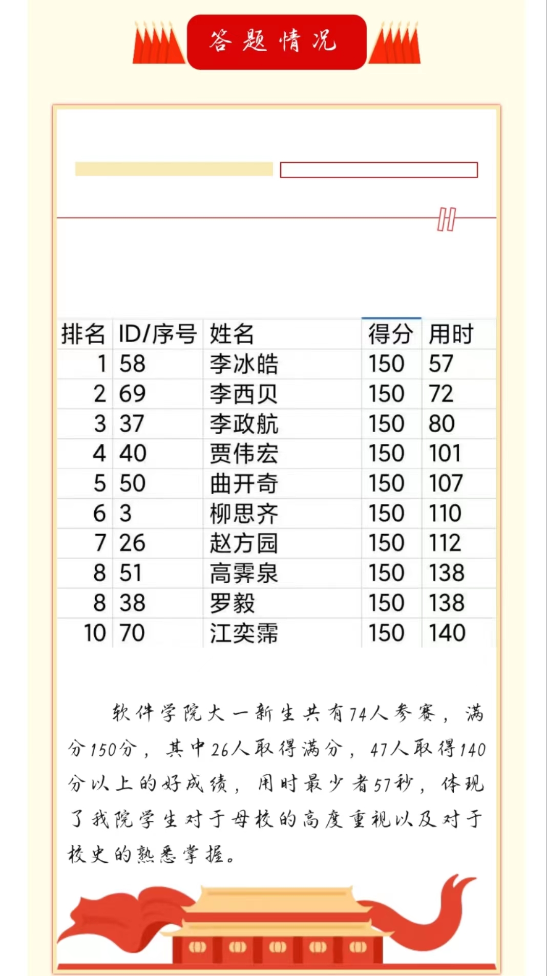 本次活动共吸引了74名同学报名参与,许多同学在赛前主动通过公司官网、公众号等多种渠道进行针对性学习,全面深入地了解了公司的发展历程和概况,为比赛做好了充足的准备。在比赛过程中,同学们反应迅速,精准作答,展现出对校史知识的熟练掌握和对母校的无限热爱。他们凭借对校史知识的深厚储备及出色的临场表现,赢得了现场观众的阵阵掌声。最终,共有26名同学取得了满分150分的好成绩,47名同学的得分超过了140分,答题最短用时仅57秒。赛后,许多同学表示,自己通过参与本次活动更真切地感受到公司深厚的文化底蕴和人文气息,增强了在w66读书的自豪之感,理想信念也更加坚定。
