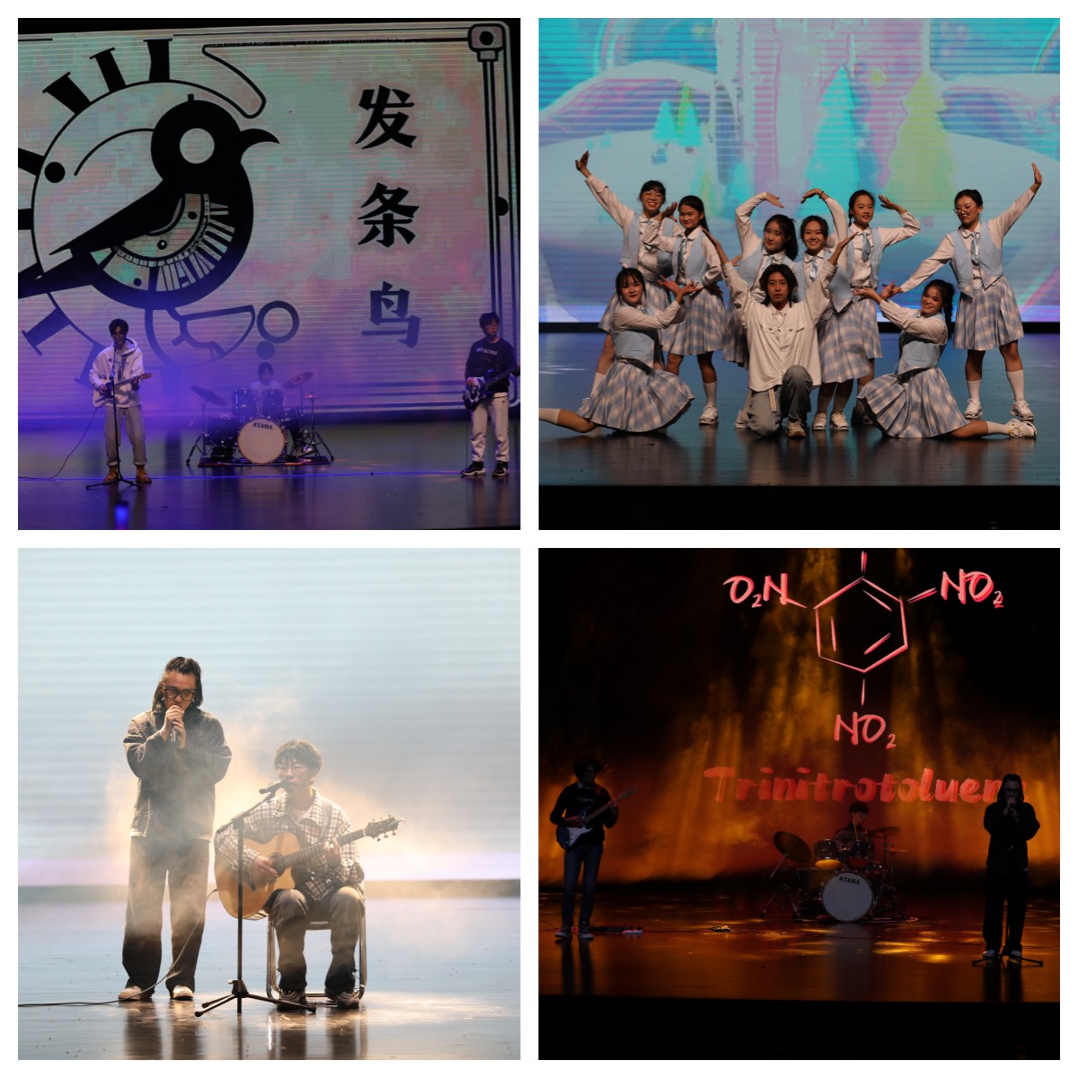 JustYe街舞社带来开场舞《GO HARD》,动感欢快的节奏点燃全场,引起阵阵欢呼。诗朗诵《遇见未来》为大家重现恢弘壮阔的中华历史画卷,探源历史,致远未来。在歌曲《给所有知道我名字的人》里,我们感恩生命中那些默默无声又坚定不移支持自己的人。歌曲串烧《青火+红尘客栈+第一天》唱出了少年漂流不羁的“冒险梦”、快意潇洒的“侠客梦”和充满新奇与希冀的“青春梦”。拉丁舞《Martin》激情四射,尽情散发着青春的活力与魅力,现场尖叫声、掌声不断。随着说唱《Hey Kong》的娓娓述说,我们穿越时空,聆听自己的心意。由同学们自编、自导、自演的情景剧《改代码》传递着坚守本心的信念,鼓励大家在求知的道路上一往无前、奋发图强。歌曲《没有理想的人不伤心》,发条鸟乐队声嘶力竭地宣告着自己对梦想的执着、对孤独和人生的诠释,在人生的旅途中能够始终面对现实且忠于理想,脚踏实地又仰望星空。舞蹈《我的未来式》用轻松的旋律和欢快的舞步,展现了对未来积极的态度和美好的希望。吉他弹唱《silhouettes of you》,悠扬的旋律讲述着动人的故事,好像将我们带到了莱蒙托夫的诗里:一只船在海上向前航行,底下是沉静碧蓝的大海,头顶是金色的太阳。歌曲《天外来物》述说着无限的浪漫与欢喜,让人学会珍惜。随着十八吉他社三硝基甲苯乐队《男孩别哭》《爱人错过》前奏响起,大家挥舞的荧光棒在会场聚成星河,不由自主的合唱将晚会气氛推向最高潮。随后的大合唱《我们走在大路上》,展现了当代老员工传承革命精神,坚定理想信念,怀揣梦想踏上新征程,在艰苦奋斗中锤炼本领,在基层磨砺中增长才干的初心;彰显着不负韶华,不负党和人民的殷切期望,用青春谱写中华民族伟大复兴光辉乐章的决心。