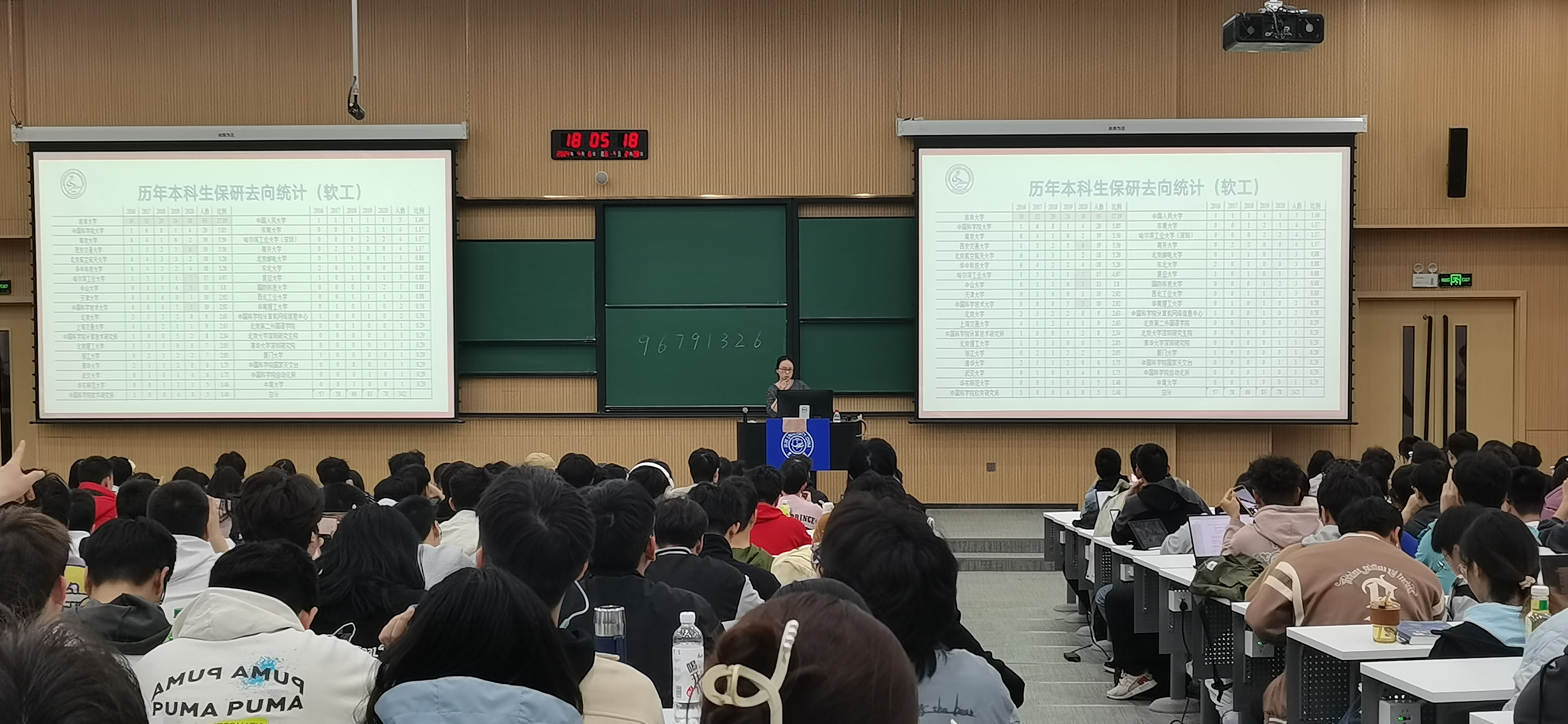 首先,戴老师基于2020-2023届毕业生的去向统计数据进行分析,向同学们展示了就业和升学人数及其所占比例,提醒同学们要了解自身的优劣势和特点,在客观评价自我能力的基础上做出适合自己的职业选择。随后,戴老师介绍过去5年公司保研员工的去向和人数、学业成绩、素质类项目加分等情况,具体讲解保研涉及的项目情况、夏令营注意事项等,并根据2020级员工的保研情况,对2021级员工的保研名额进行预估。同时,戴老师还分析2020级员工考研相关数据,详细介绍本校计算机和软件两个专业的初试和复试情况,并提醒同学们要慎重择校,强调备考过程中持续努力的重要性。最后,针对具有不同就业意向的同学,戴老师对过去5年公司员工签约大厂、小微企业、国有企业等就业单位的实际情况进行介绍,重点对2023年秋招的签约情况进行说明,叮嘱拟就业的同学们提前准备个人简历,利用网络资源提高编程能力,勇于尝试,在实习过程中注重积累经验,不断丰富阅历,在未来的秋招中实现高质量就业。此外,戴老师还建议同学们及时关注公司发布的招聘信息,把握好各类工作机遇,针对出国和备考选调的同学,戴老师指出要选择适合自身的目标院校和单位,不能好高骛远,可以在多方了解相关信息的基础上做出正确的选择。