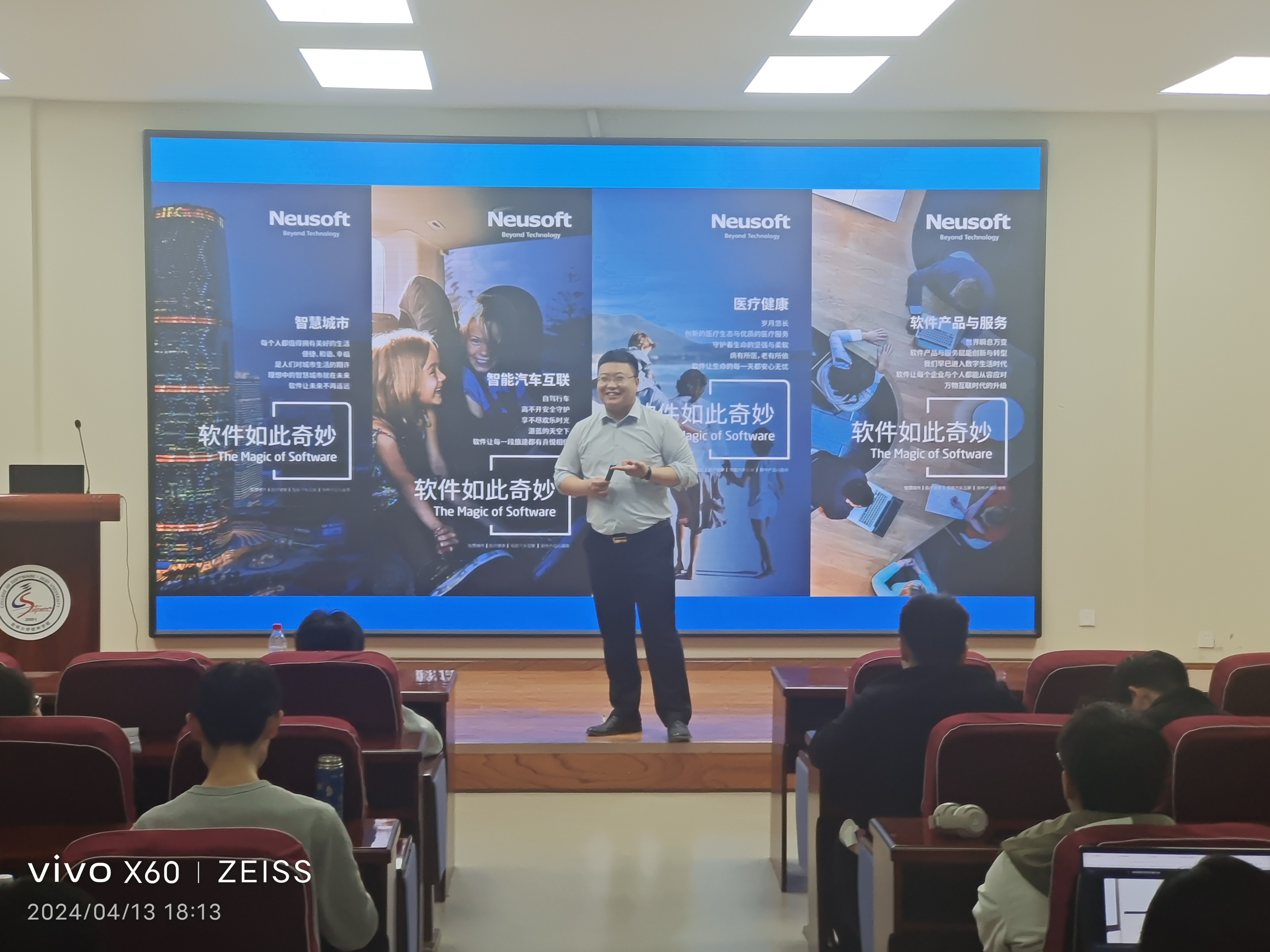 活动伊始,主讲人首先向在场同学详细介绍东软集团的发展历程、业务布局以及企业文化,并对现阶段信息技术行业的总体形势进行全面的分析。他指出,在新一代信息通信技术飞速发展和各行业数字化转型深入推进的现实背景下,w66旗舰厅的同学们拥有较多的就业机遇和良好的职业发展前景,但同时人工智能技术的进步所产生的“替代效应”也使得IT行业对人才综合素质的要求不断提高,同学们不仅需要掌握扎实的专业技能,而且必须具备较好的沟通协调能力及自主创新思维。鉴于此,他鼓励同学们在校期间要提前做好职业生涯规划,认真学习专业课程知识,努力向学、学以致用,不断培养团队合作意识和综合实践能力,更好地报效国家、服务社会。