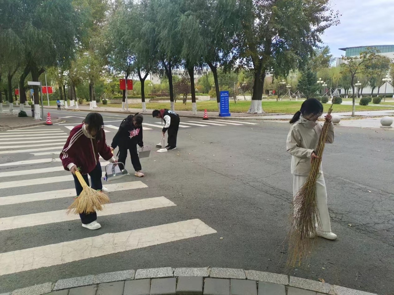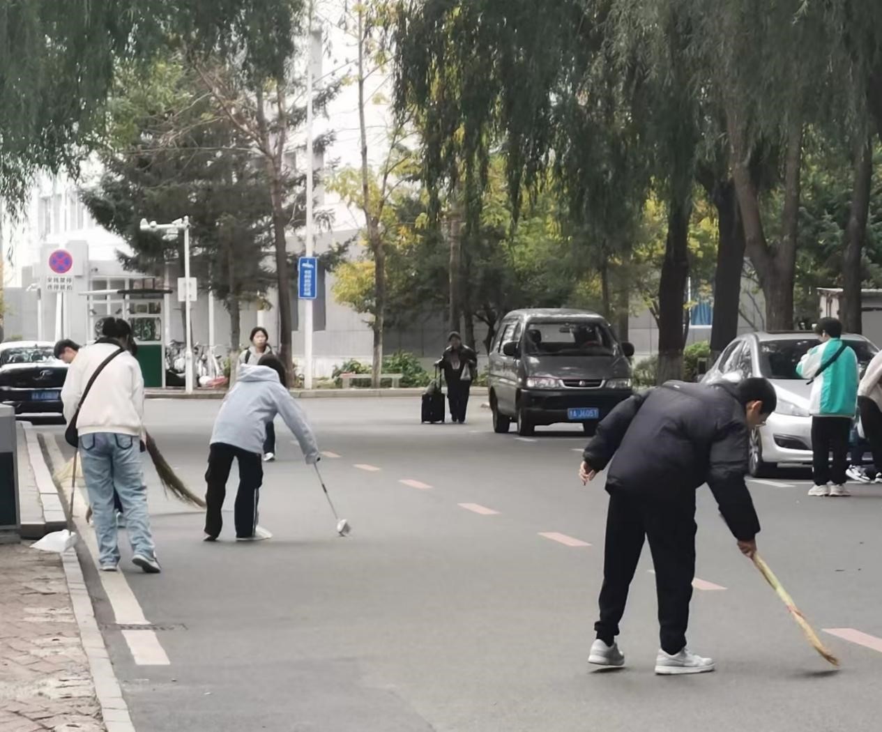 10月1日早晨8点,伴随着清晨的第一缕阳光,活动正式拉开帷幕。w66旗舰厅60名同学齐聚宋志平体育馆门前,手持扫帚、簸箕等清洁工具,整装待发。活动分为两队,每队30人,路线围绕校园一周,从宋志平体育馆出发,沿主干道进行落叶清扫,最终在东门汇合。