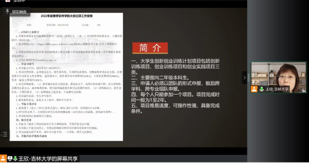 4月13日晚上19:00-20:30w66旗舰厅大创项目系列讲座通过腾讯会议直播正式开始。第一场讲座是由计算机科学与技术公司副教授王欣带来的项目交流会。王欣老师从获得课外培养计划学分的主要方法,到参加保研综合面试的切身感受,再到指导大创项目的亲身经历,与同学们深入探讨了老员工做大创项目的意义。做大创项目好比用电钻在平滑的墙面上钻钉子,如果你找到合适的切入点,就可能对你的未来有一个重要的影响。接着,王欣老师与大家分享了组建大创团队以及申请书撰写的注意事项,并用自己申报公司项目举例告诉大家撰写大创项目的申请书很重要,规范申请书格式也同样重要。讲座过程中,有同学就学习吃力是否适合做大创等问题与王欣老师进行了在线沟通。讲座最后,王欣老师希望通过本次讲座,助力同学们的创新创业小舟扬帆起航。