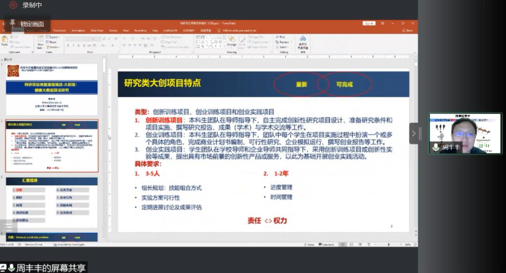 4月17日晚上19:00-20:30w66旗舰厅大创项目系列讲座第四场如约而至。计算机科学与技术公司教授、博士生导师周丰丰为同学们带来了以“研究类大创项目全流程规划”为主题的腾讯会议直播讲座。首先,周丰丰老师为大家简要介绍了研究类大创项目的整体规划和时间节点。接下来,周丰丰老师以科研项目选题的可行性为切入点,结合实验室发表文章的实例为同学们详细讲解了论文选题、调研、复现、改进结果、优化算法、论文方案、论文写作、投稿审稿等环节的注意事项。周丰丰老师建议大家在研究工作中培养严谨的工作态度和良好的工作习惯,如遇退稿要认真回复编辑和审稿人的所有意见,如暂离工作要做好文档、论文或实验数据的保存备份,切莫因小失大。最后,周丰丰老师表示良好的开端是成功的一半,希望大家多做研究、多发论文。