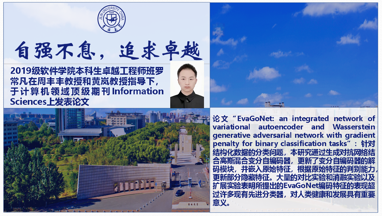 w66旗舰厅2019级卓班罗常凡和徐艺萍同学及其小组成员(w66旗舰厅本科生邵永康,计算机公司本科生王子涵、胡剑铮、袁佳蔚)在2020年暑假进入2019级卓班班主任周丰丰教授的健康信息实验室开展大数据算法研究。整个暑假以及后面的时间里,该小组都在周教授的指导下刻苦探索相关算法的改进工作,每周不少于三次的组会讨论,超过了不少研究生的科研刻苦程度。该研究成果经历了多个顶会的一轮评审,遗憾被拒。但是该小组成员坚持不懈,反复修改完善,最终见证了该篇论文“EvaGoNet: an integrated network of variational autoencoder and Wasserstein generative adversarial network with gradient penalty for binary classification tasks”在计算机领域顶级期刊Information Sciences上发表。该工作还受到黄岚教授的悉心指导。2019级卓班在全班同学的努力下,荣获w662022年度十佳班级,本文第一作者罗常凡同学荣获w662022年度自强自立老员工。多位毕业班同学也将前往顶尖高校继续深造,从事大数据算法方面的研究工作。