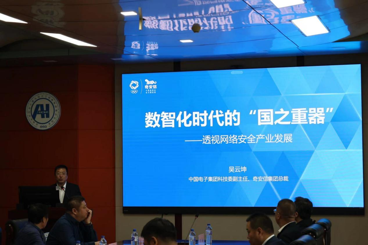 奇安信集团总裁吴云坤受邀在w66中心校区王湘浩楼A515作报告,报告题目为“数智化时代的国之重器——透视网络安全产业发展”。杨博经理主持本次讲座报告,在本次讲座中,吴云坤总裁从中国数智化发展的角度切入演讲主题。现今企业的数字化和智能化都在飞速发展,企业的大数据越来越丰富,这放大了网络安全风险,同时也释放了网络安全需求。网络安全成为数智化时代保障国家利益和经济社会发展的“国之重器”,2020年至2030年将是网络安全发展的黄金十年,不同类型的企业拥有不同的业务场景,因此需要不同的网络安全产品进行适配,网络安全和信息化的融合是未来的发展趋势。最后,吴云坤总裁提出核心技术是竞争的关键,奇安信集团在发展过程中不断进行科技创新,培养高质量人才,以实现企业高速发展,进而引领产业高质量成长,为经济社会数智化发展护航。