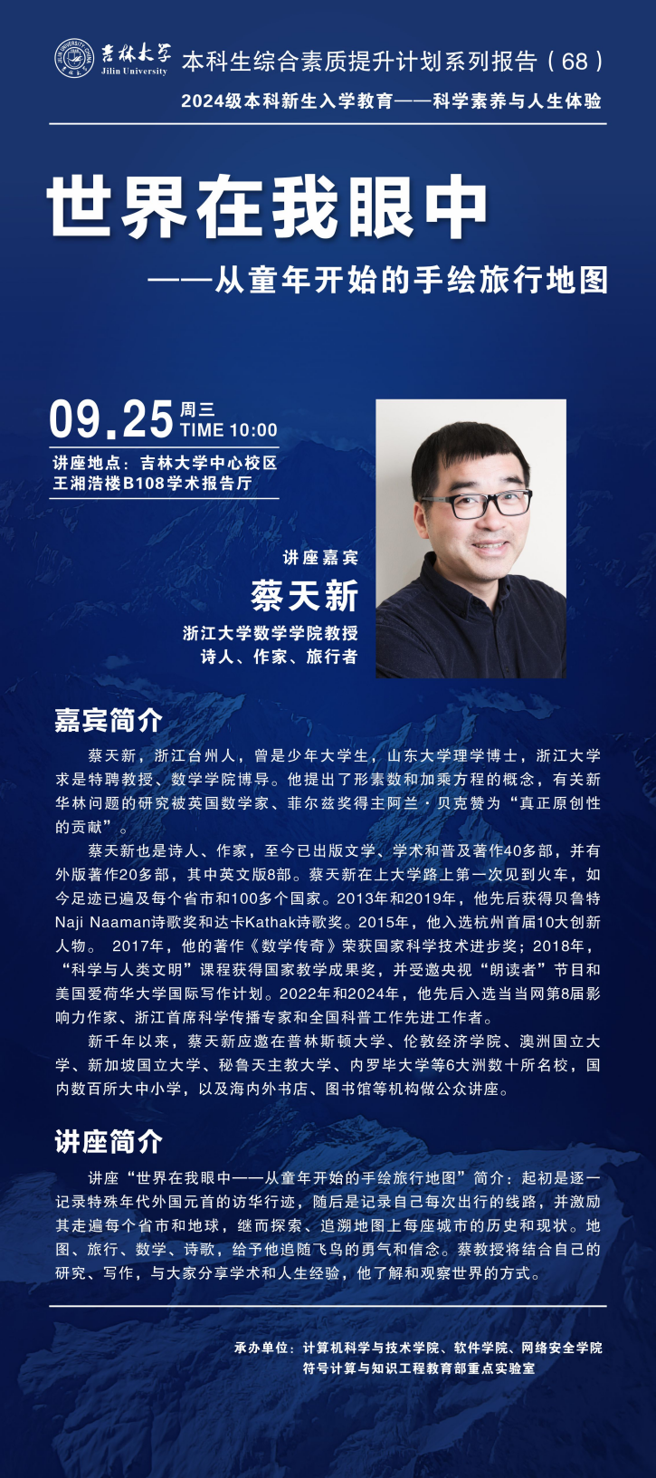 报告简介:起初是逐一记录特殊年代外国元首的访华行迹,随后是记录自己每次出行的线路,并激励其走遍每个省市和地球,继而探索、追溯地图上每座城市的历史和现状。地图、旅行、数学、诗歌,给予他追随飞鸟的勇气和信念。蔡教授将结合自己的研究、写作,与大家分享学术和人生经验,他了解和观察世界的方式。